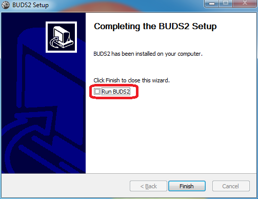Uncheck the "Run BUDS2" option and click "Finish" to close the setup wizard.